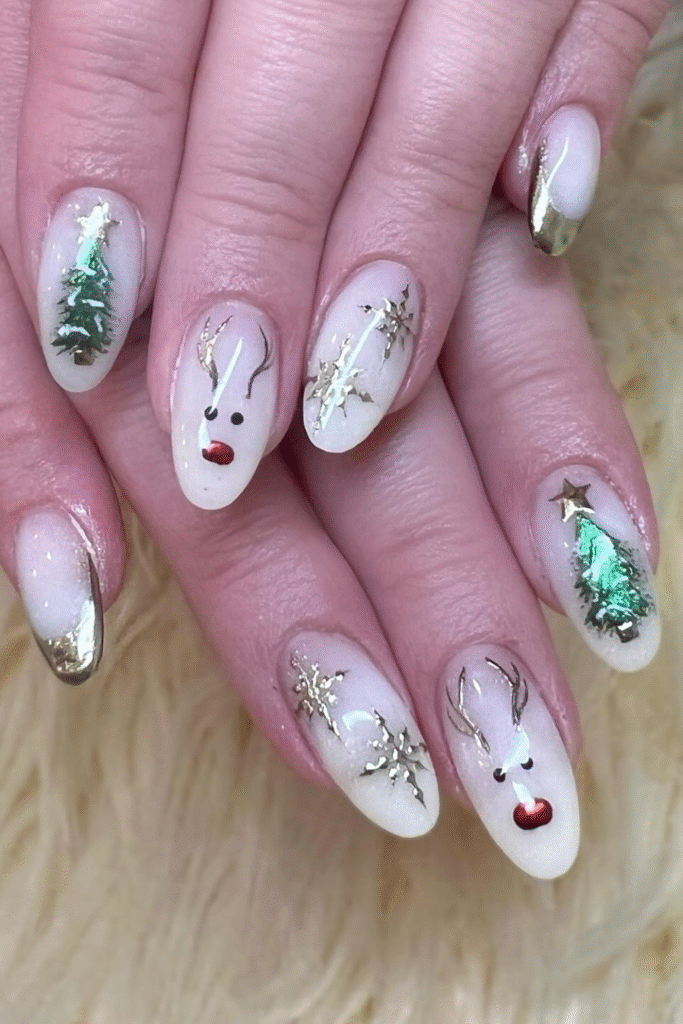 You will start with a creamy nude base, then paint golden stars, green trees, and a tiny red-nosed reindeer, it is adorable and still elegant.