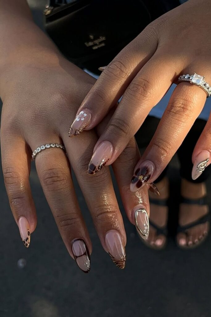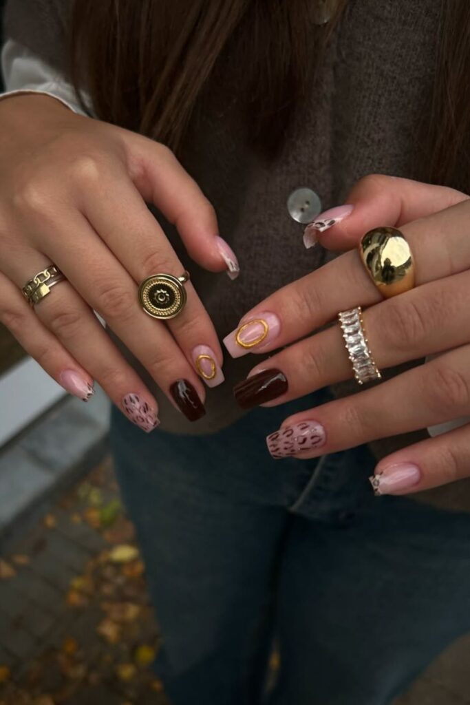 The warm brown tones with soft animal-like spots bring a fun fall twist, while the white tips and gold details keep it polished.