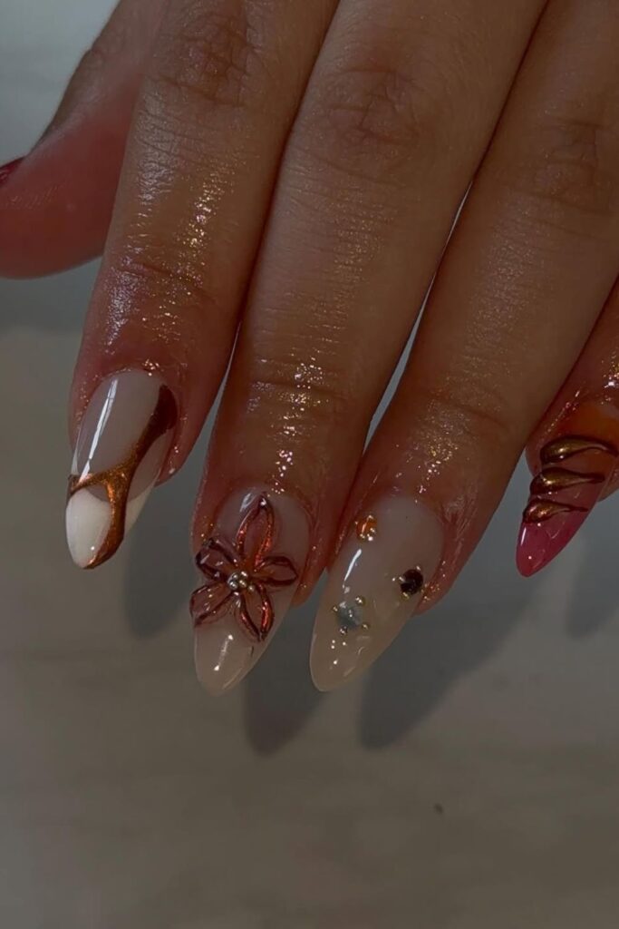 The warm copper outline, delicate floral design, and soft glossy base give this look that perfect fall romance vibe.