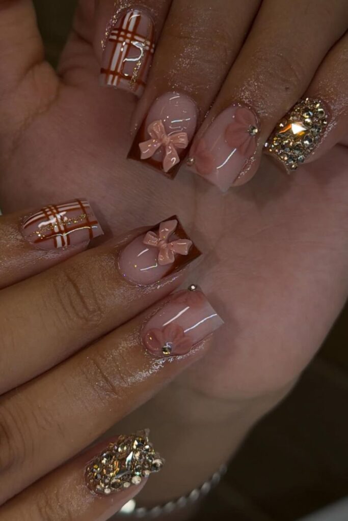 You get that the brown plaid tips give it that warm autumn vibe, while the 3D bows and rhinestones add a rich, glam touch.