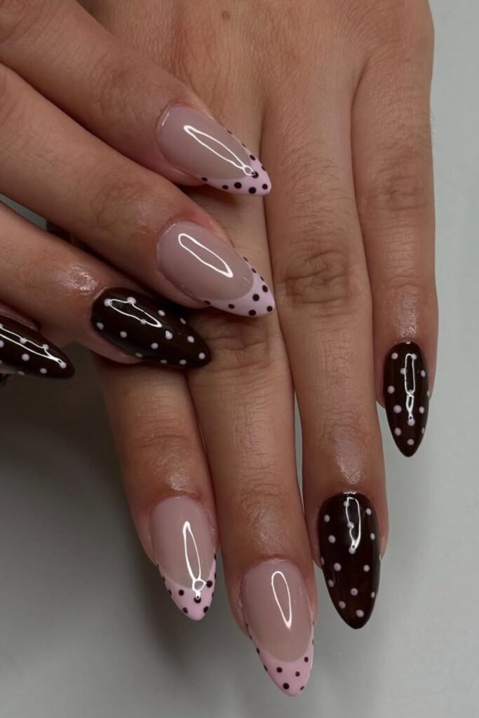 The soft pink base with brown polka dot tips gives it a sweet, cozy vibe, while the full brown nails with white dots add just the right contrast.