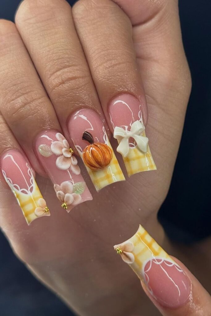 The yellow plaid tips bring a soft seasonal warmth, while the 3D flowers and pumpkin make the design pop.