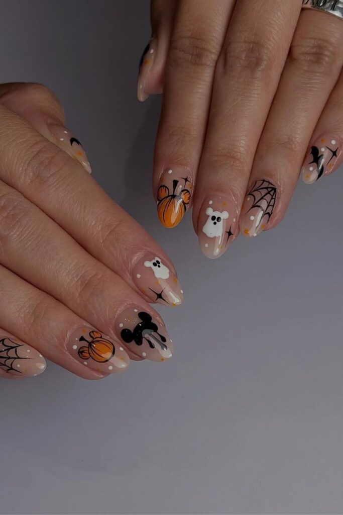 This soft nude base keeps things light while the tiny ghosts, pumpkins, and spider webs add just enough Halloween and fall charm.