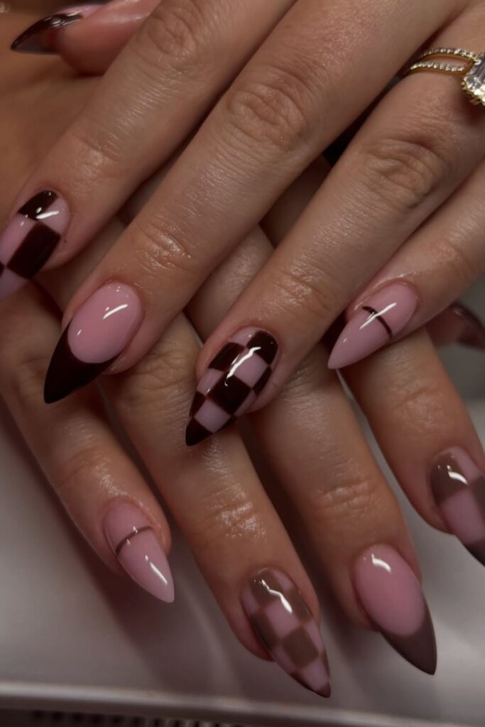 You see the deep brown checkered tips instantly bring cozy fall energy, while the soft pink base keeps your everything balanced and chic.
