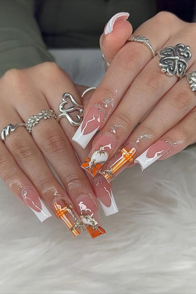 To recreate, you can start with a nude base, build your sharp white tips, then add orange details and subtle gold accents to bring everything together.
