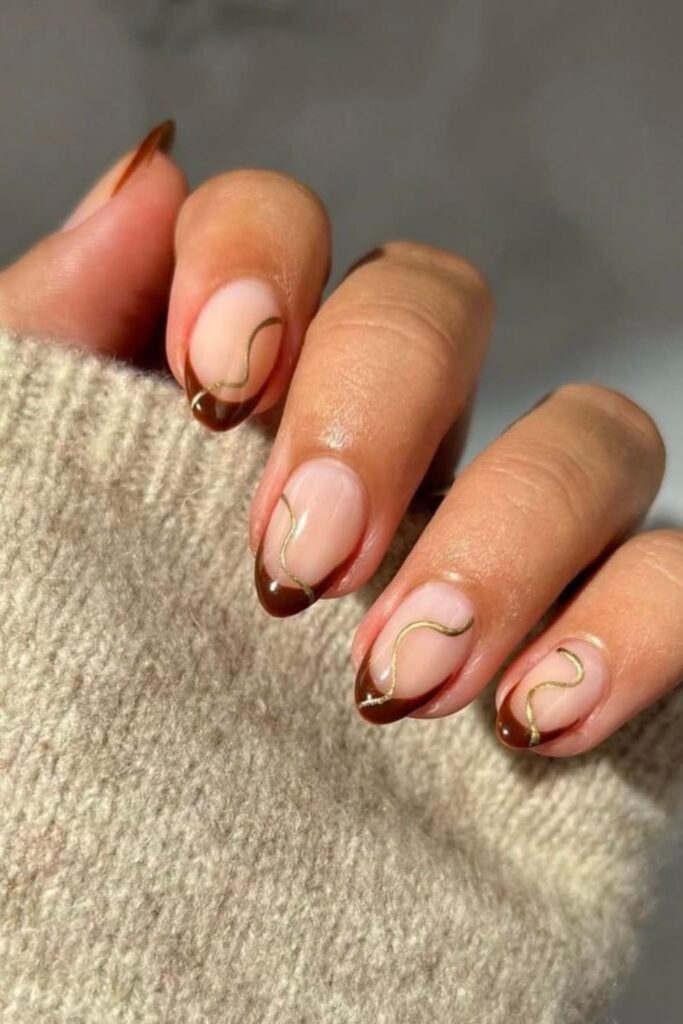 The deep brown French tips bring in that warm autumn tone, and the soft gold swirls add just the right amount of elegance.