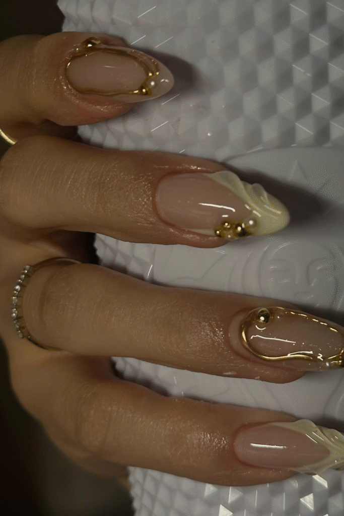 The nude base keeps everything clean while the gold frame gives it that elegant, polished edge.