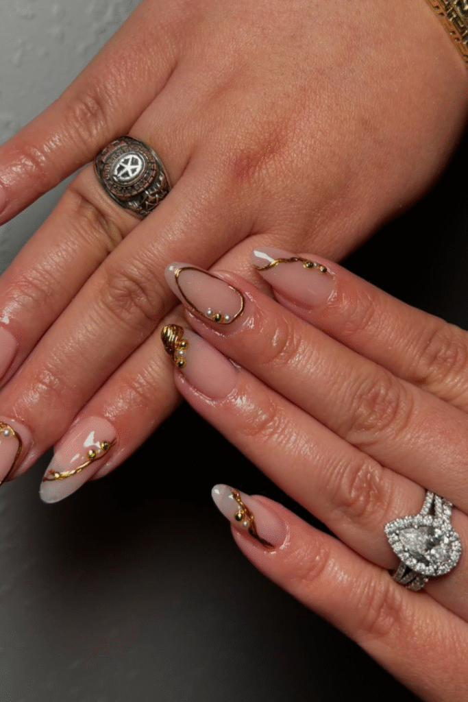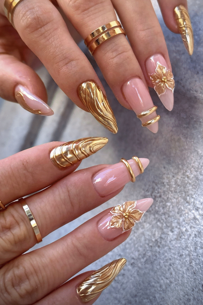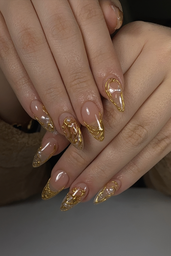 You can layer gold gel slowly to get those raised patterns and combine it with clear or pink tones to keep the design balanced.