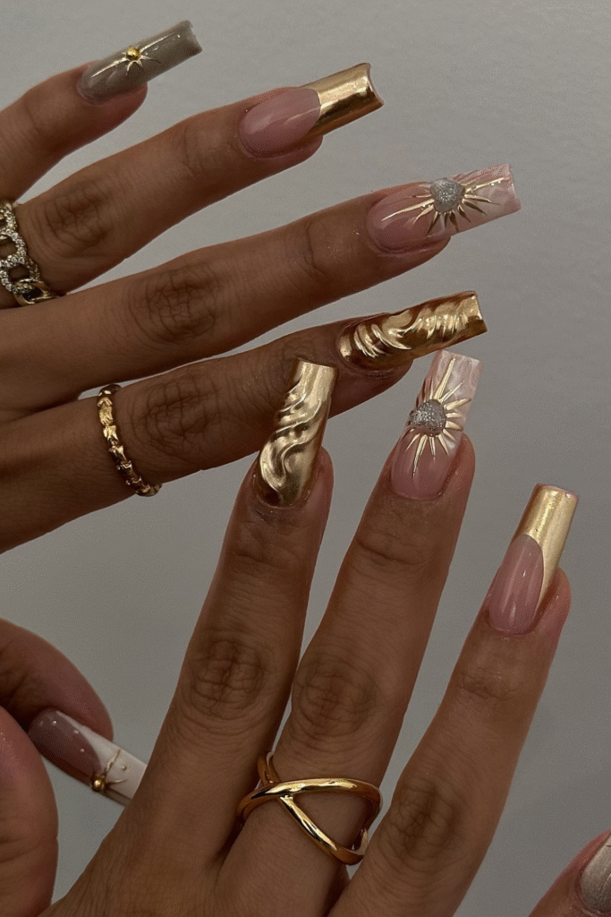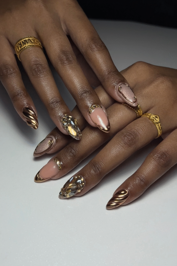 You will feel like royalty wearing these. The mix of gold chrome, crystal embellishments, and sculpted shapes gives the nails a crown like finish.