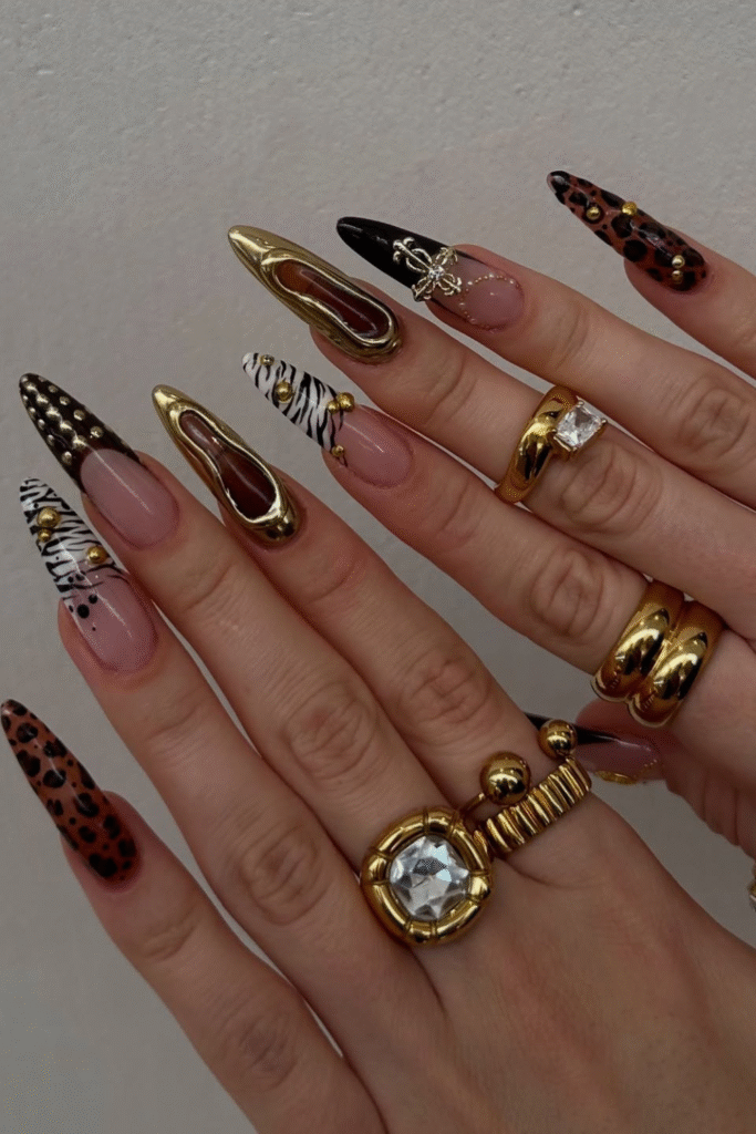 You love a bold moment? This mix of gold chrome, zebra print, black tips, and studs is made for that.