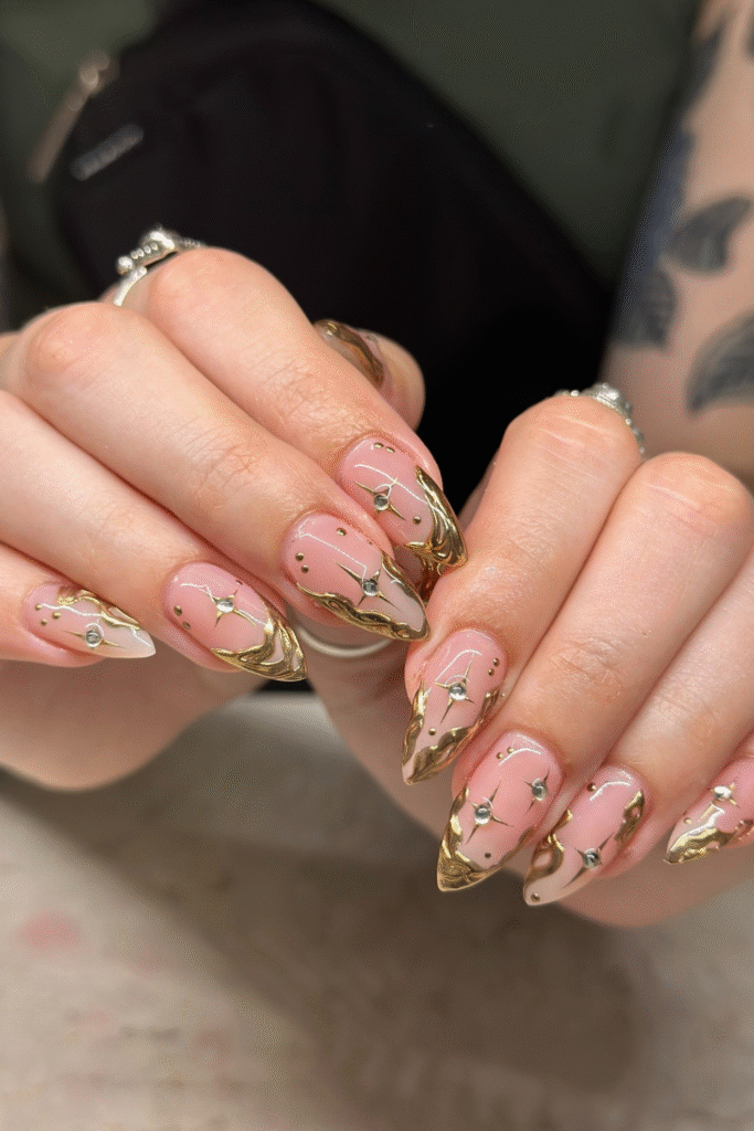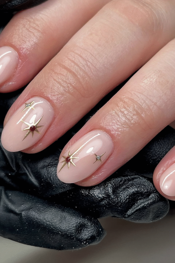 You do not need a loud design to look polished. This soft nude base with tiny gold starbursts gives your nails just enough sparkle to feel special.