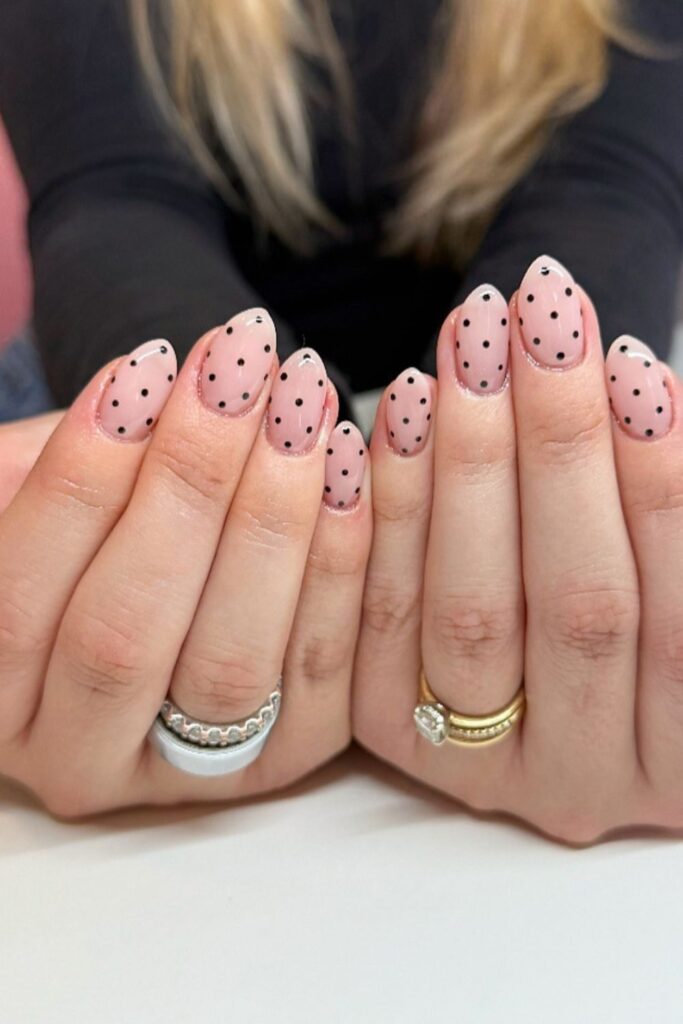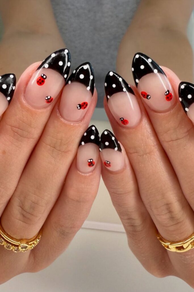 You match black French tips with dotted details and tiny red ladybugs that make the design cute instead of dramatic.
