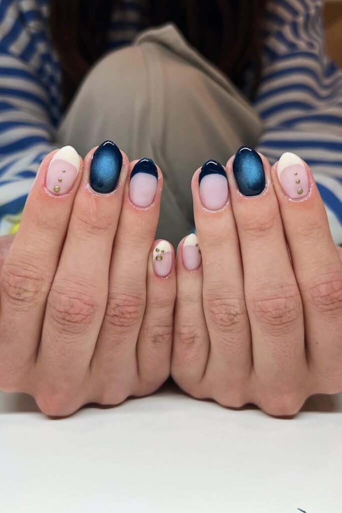 You pick this navy and cream blend when you want a cool tone without harsh contrast.