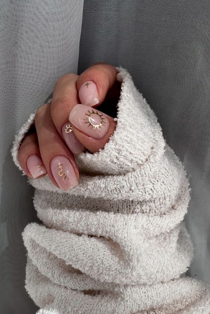 You tap into soft nude shades that make the tiny gold sun and moon accents look refined and clean.