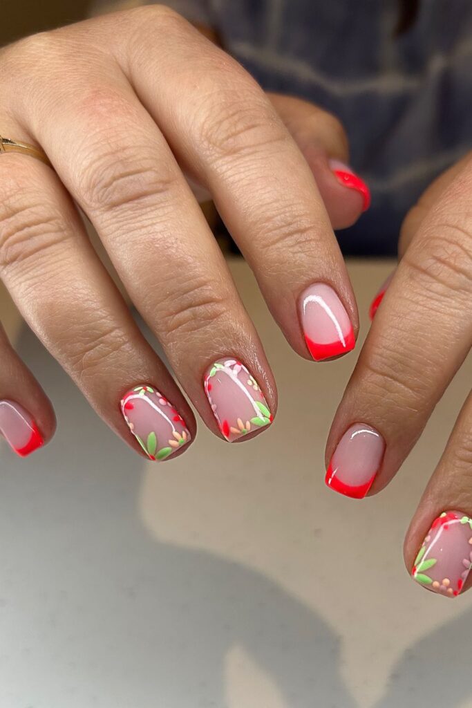 You add a sharp coral tip and pair it with tiny leaves and floral dots for a bright spring-to-summer switch.
