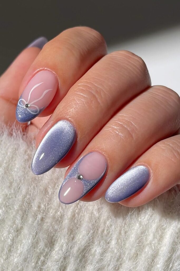 You shine with a lilac shimmer that pairs with soft pink ovals and a tiny white bow for a sweet, polished effect.