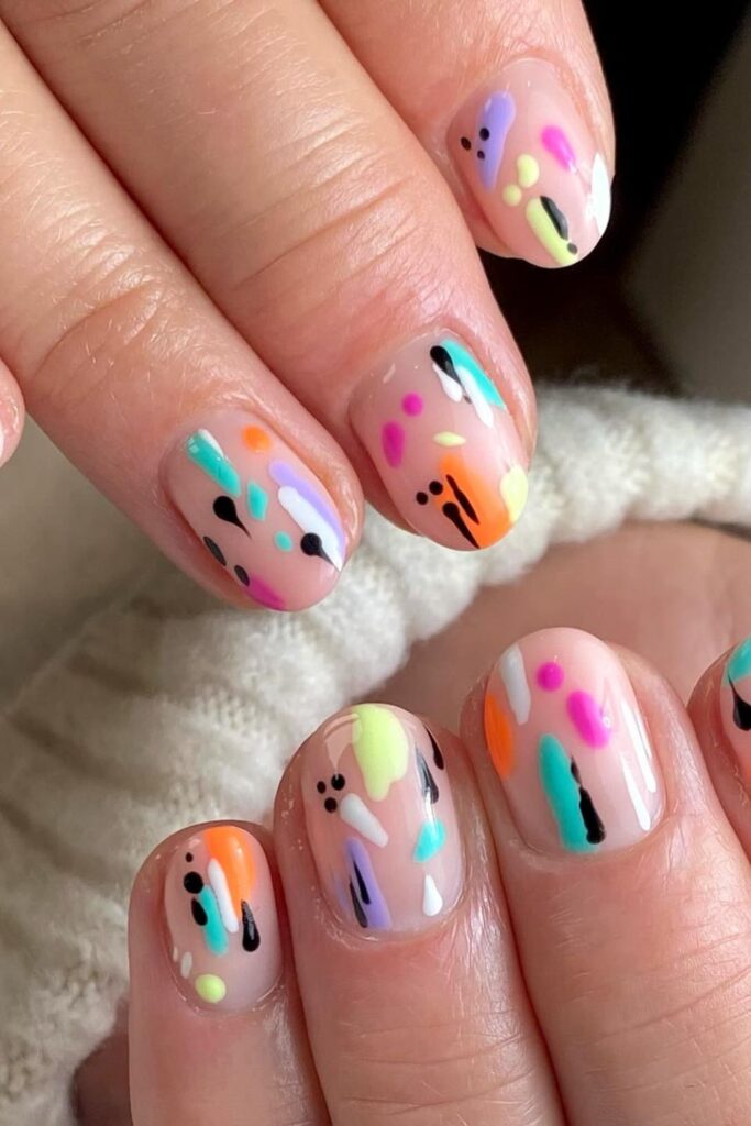You embrace a nude base covered with bold multicolor strokes that create an artsy, upbeat feel.
