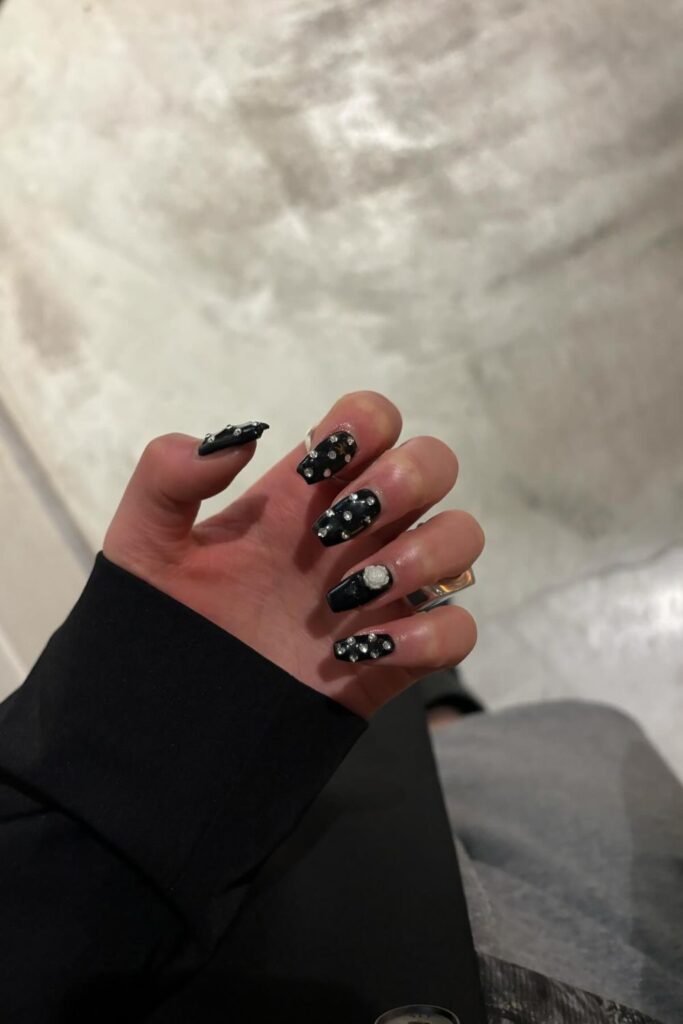 You mix bold black polish with raised pearls to form a look that turns every gesture into a statement.