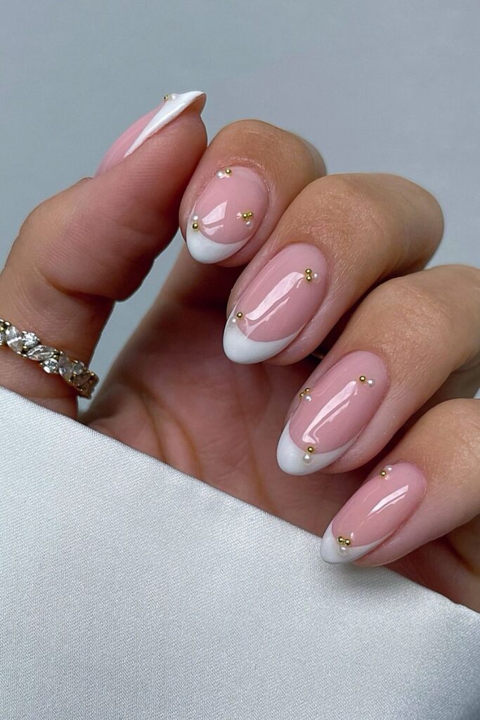 You update a classic French by adding tiny gold beads for a soft but polished finish.