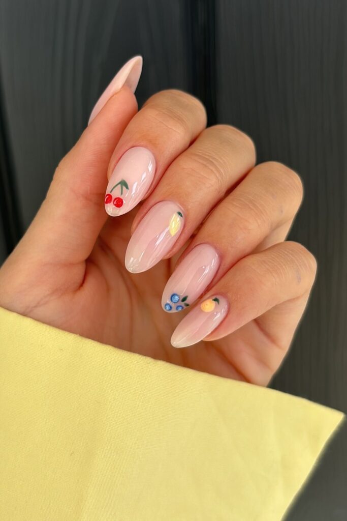 You keep the base soft so the tiny fruits stay clear and bright on each nail.