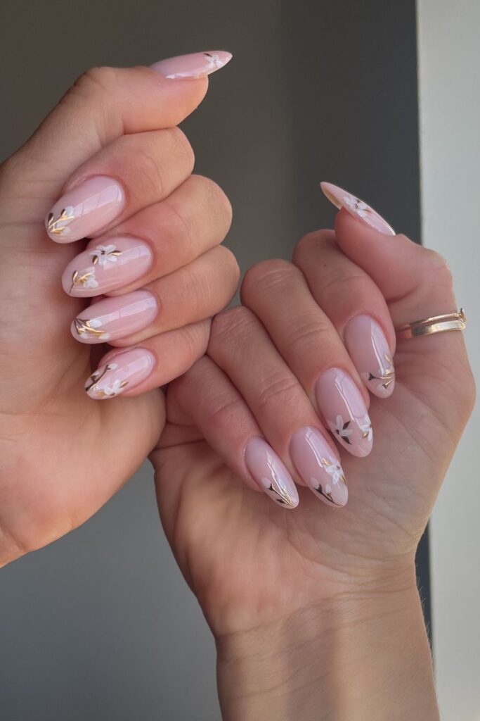 You keep the base nude so the floral art takes the spotlight.