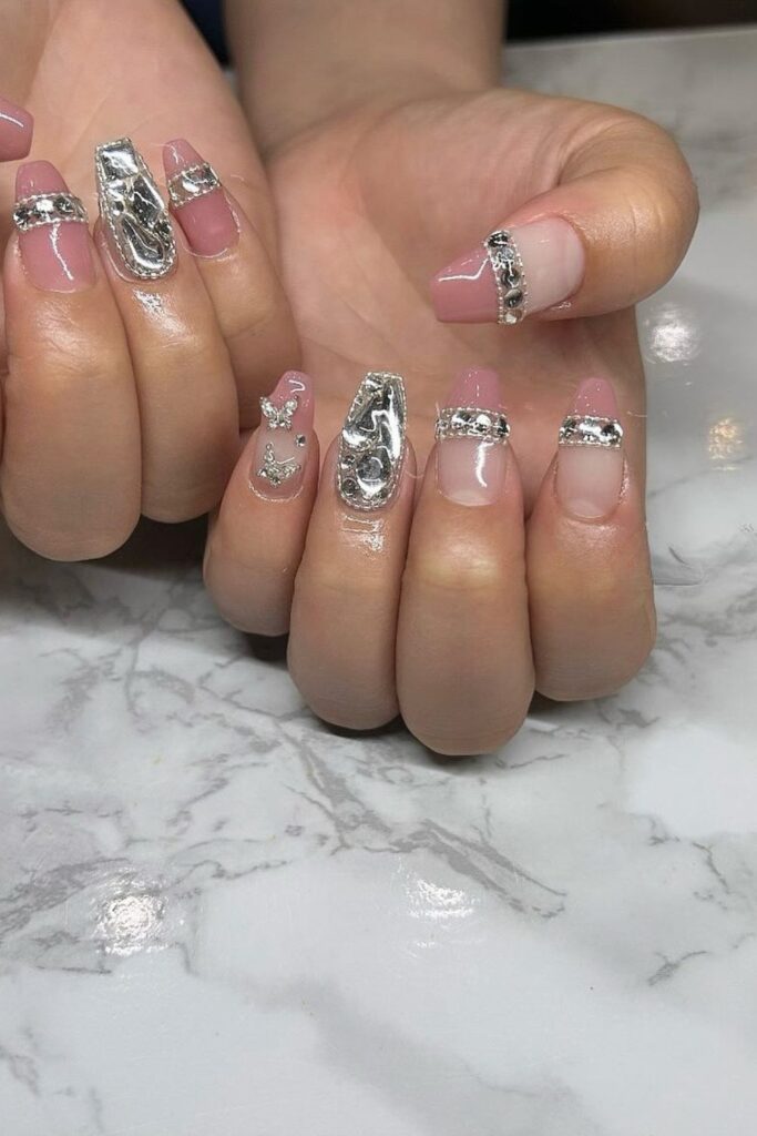 You choose this silver chrome set when you want bold detail on a soft pink base.
