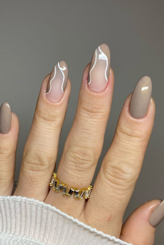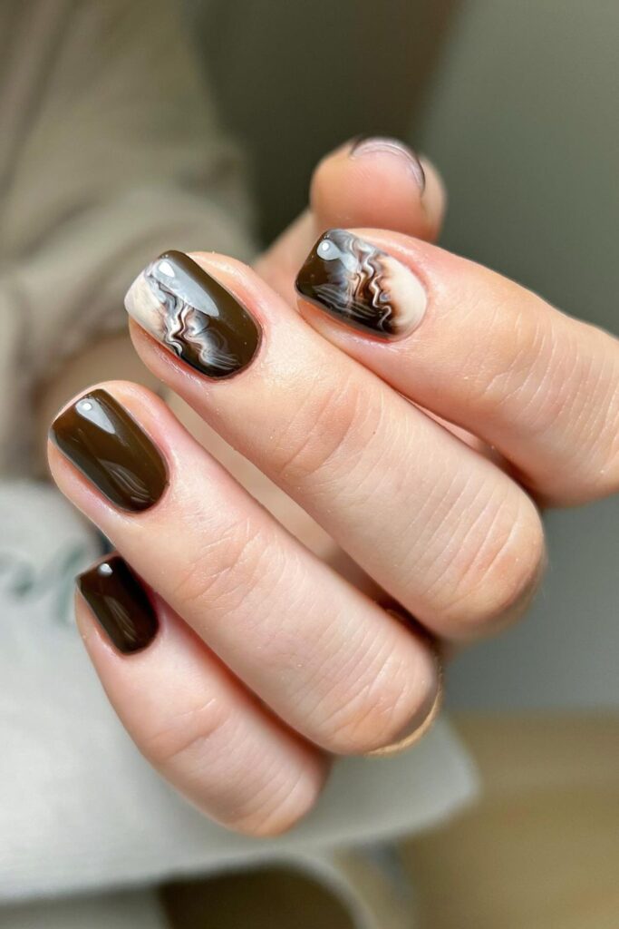 If your aim is this look, ask for mocha on most nails and two swirl accents with brown and beige lines.