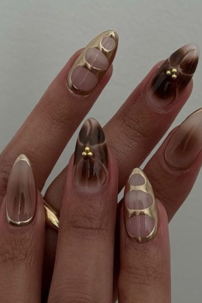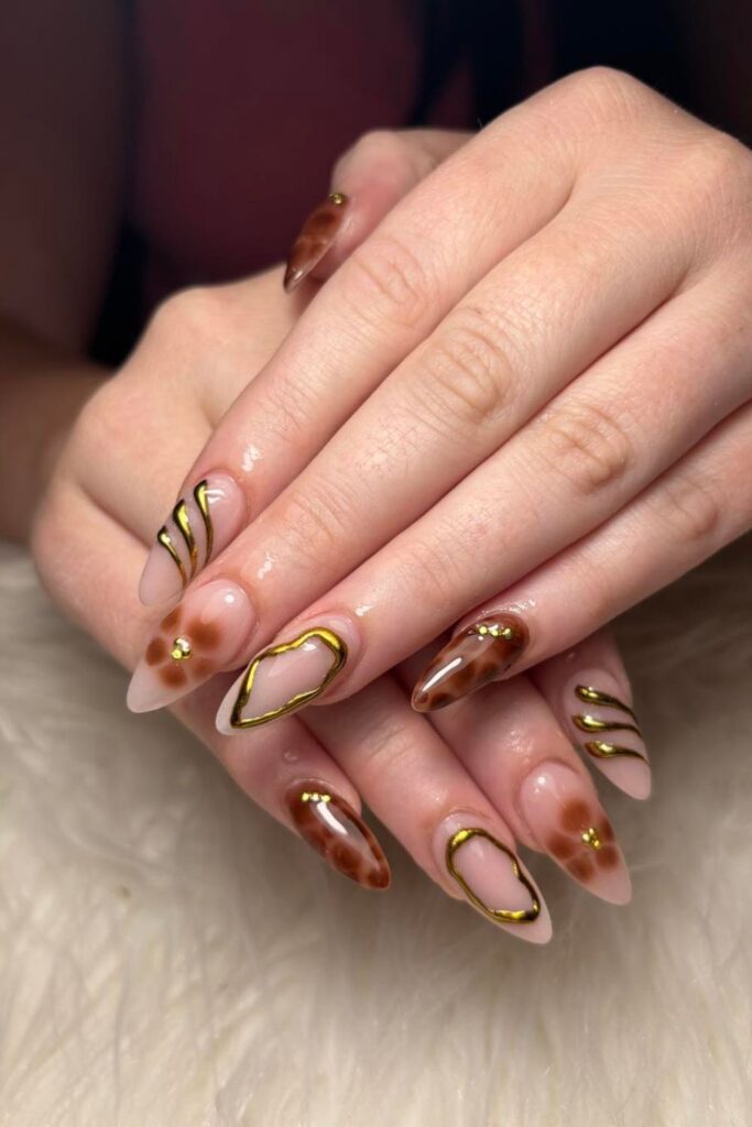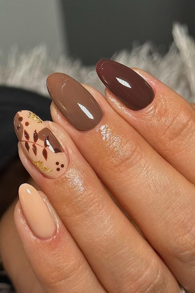 You blend brown, tan, and nude with leaf art and small gold flecks.