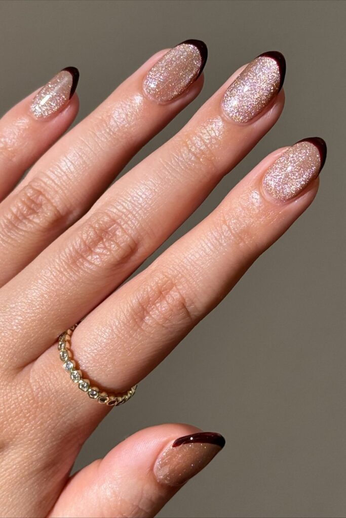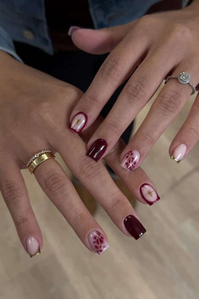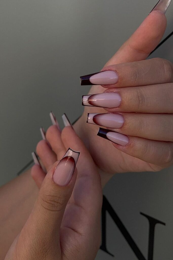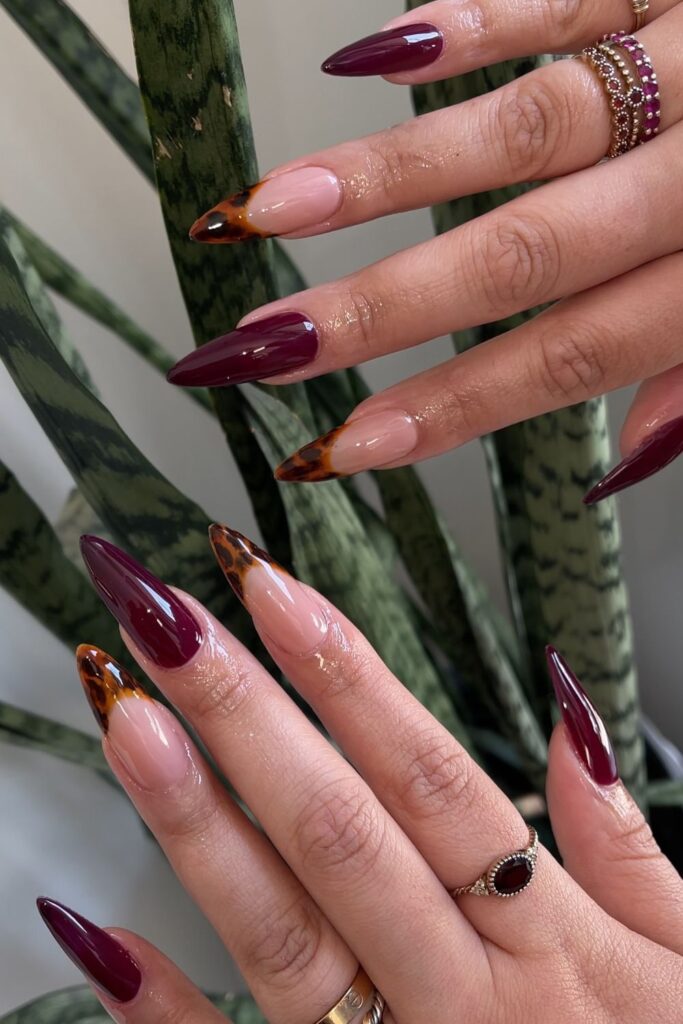 You shape a bold mix with deep wine nails next to soft nude bases.