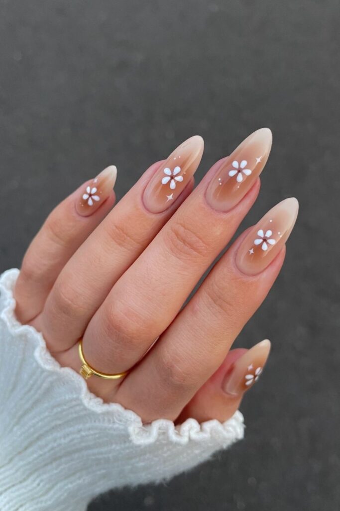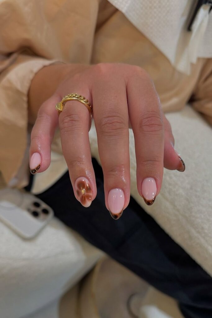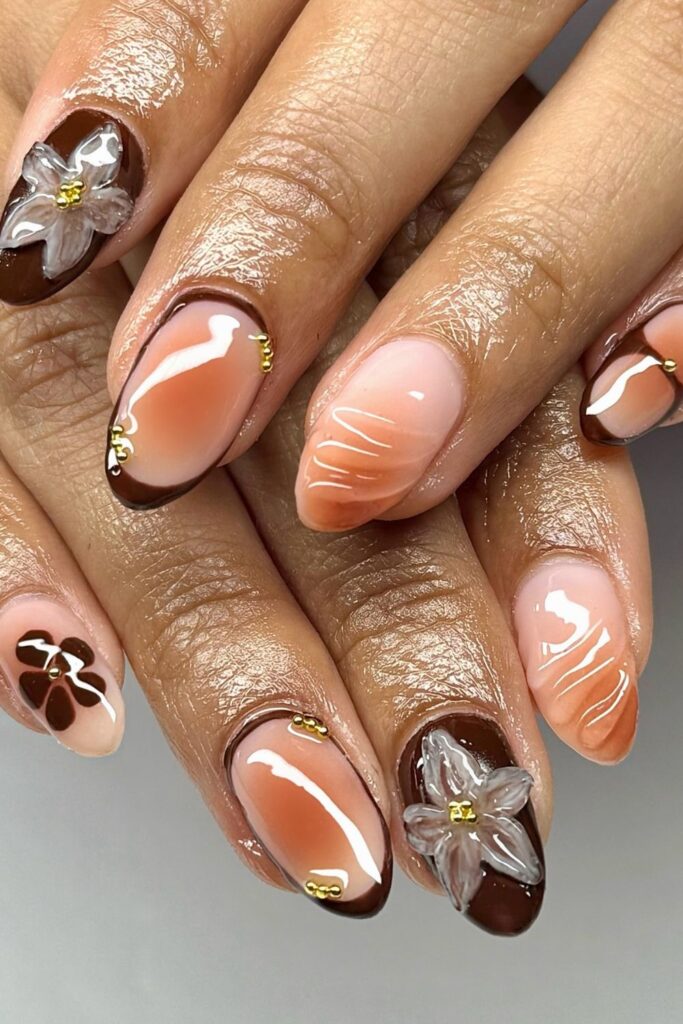 You pair nude fades with mocha tips and flower detail for a soft look.