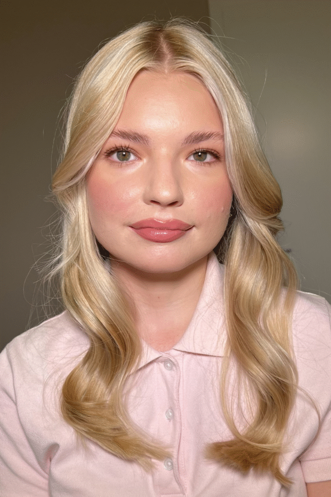 You keep lips glossy and eyes softly lifted through faint lashes for a youthful vibe.