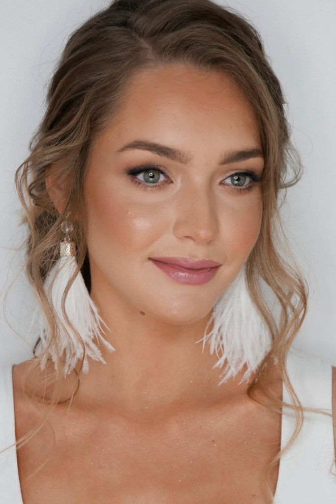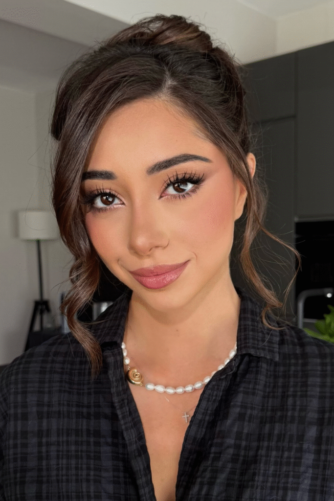 You pair it with a soft rose lipstick that adds elegance without overpowering your tone.