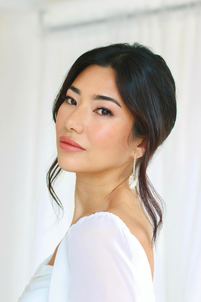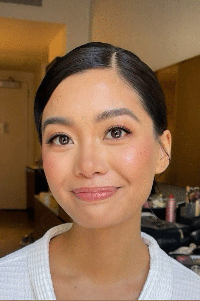 You balance warmth and brightness with a peach-toned blush that connects eyes and lips in harmony.
