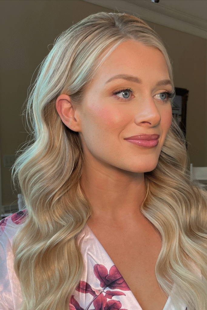 You enhance glow with a peach tint that complements wavy hair perfectly.