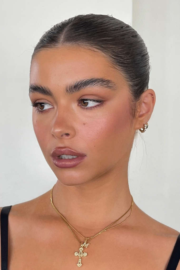 You bring balance with glossy lips and brushed brows that frame the face naturally.