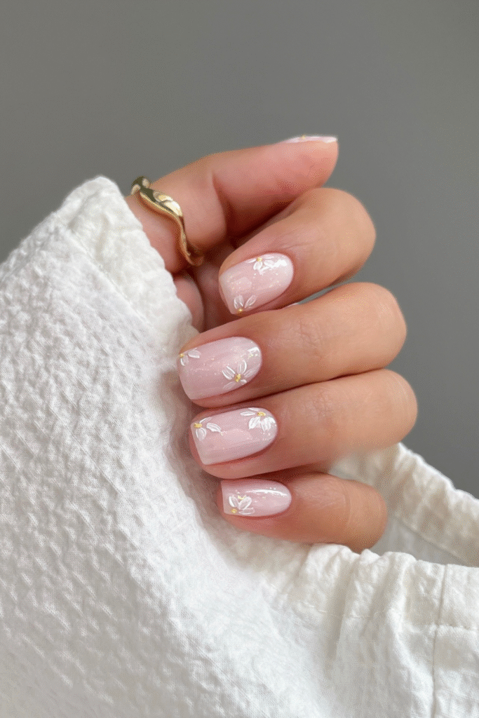 You can bring softness to your look with tiny white daisies resting on a sheer pink base.