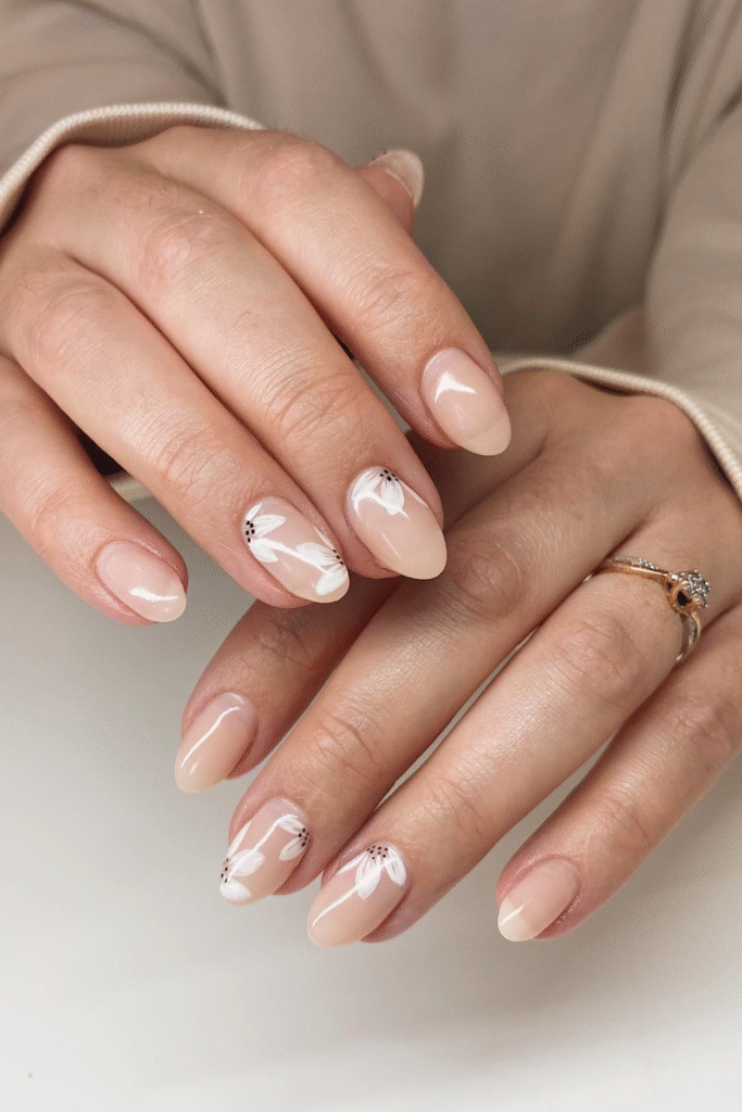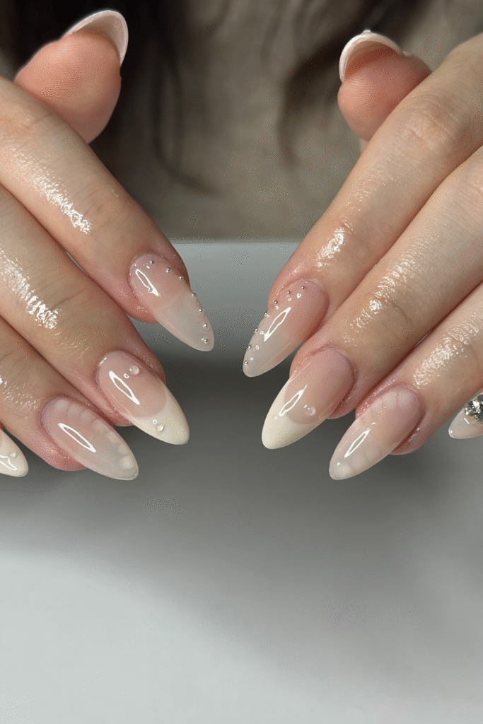 You can lean toward sheer pinks, milky whites, and soft beige bases with tiny twists, maybe micro-French tips or subtle shimmer.