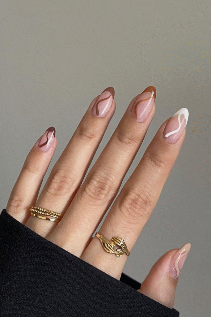 You bring energy into your manicure with caramel and white swirls floating on a nude base.