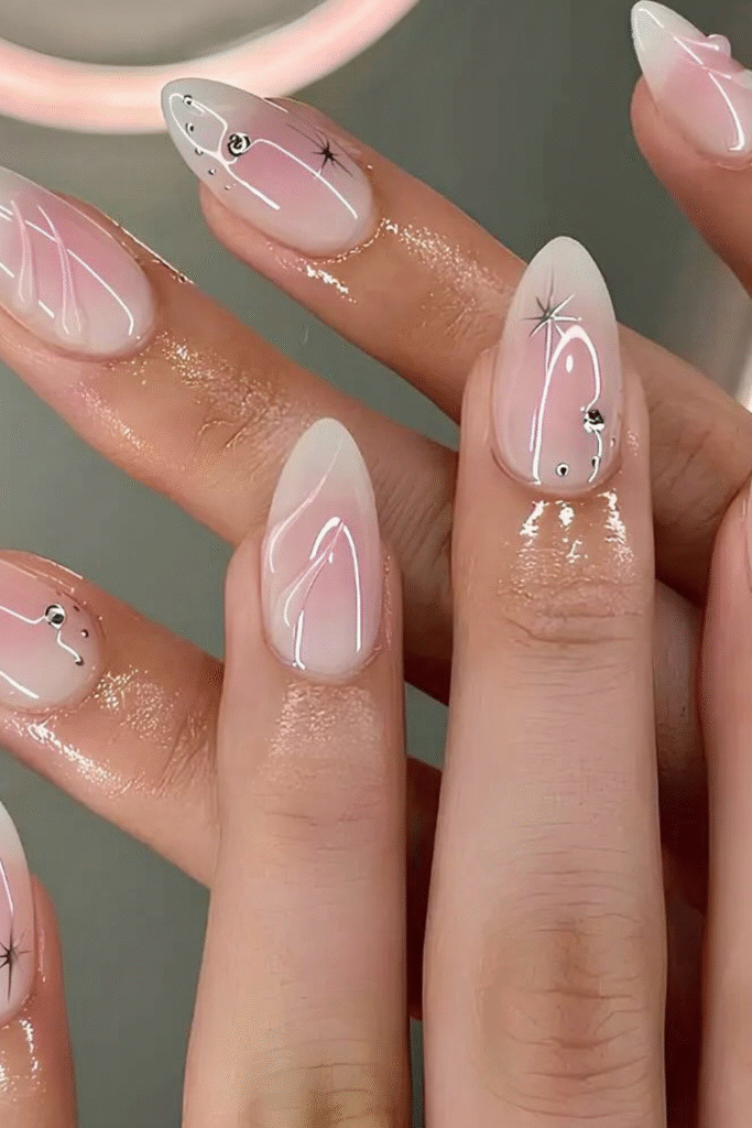 You can paint your nails in a translucent nude, then layer fine chrome lines and micro stars for that spacey glow.