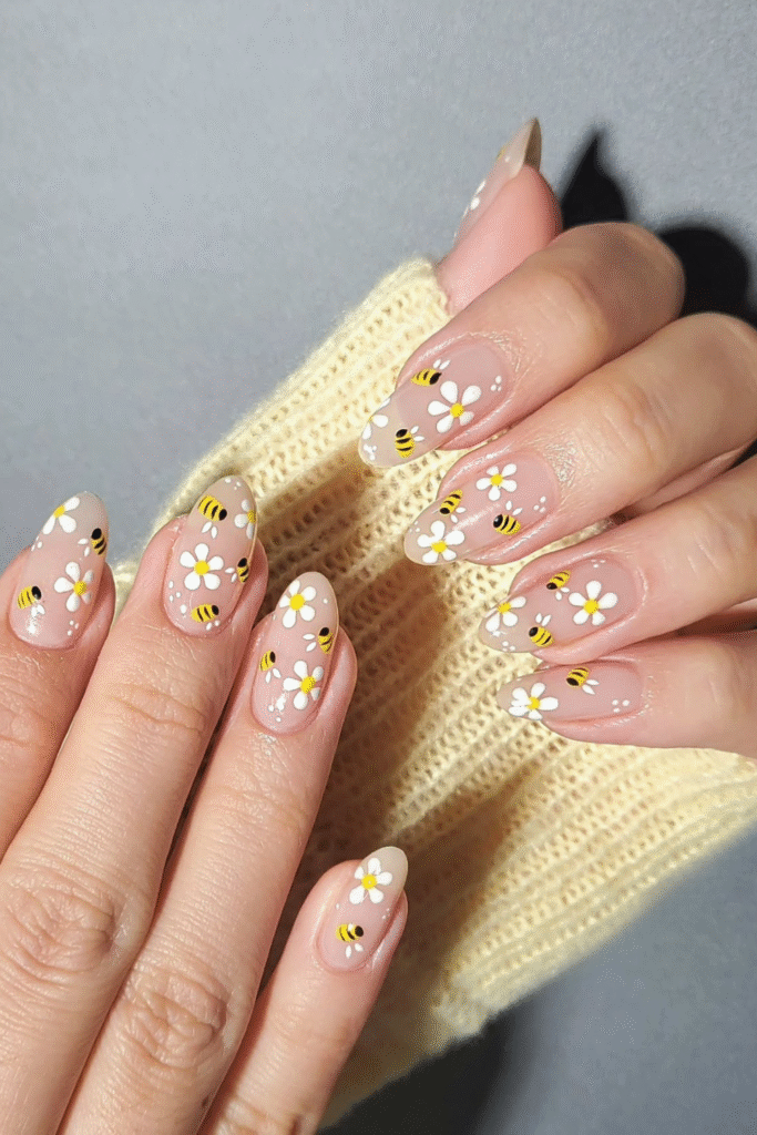 You add personality through art that feels joyful tiny daisies, sweet bees, and a sheer nude base underneath.