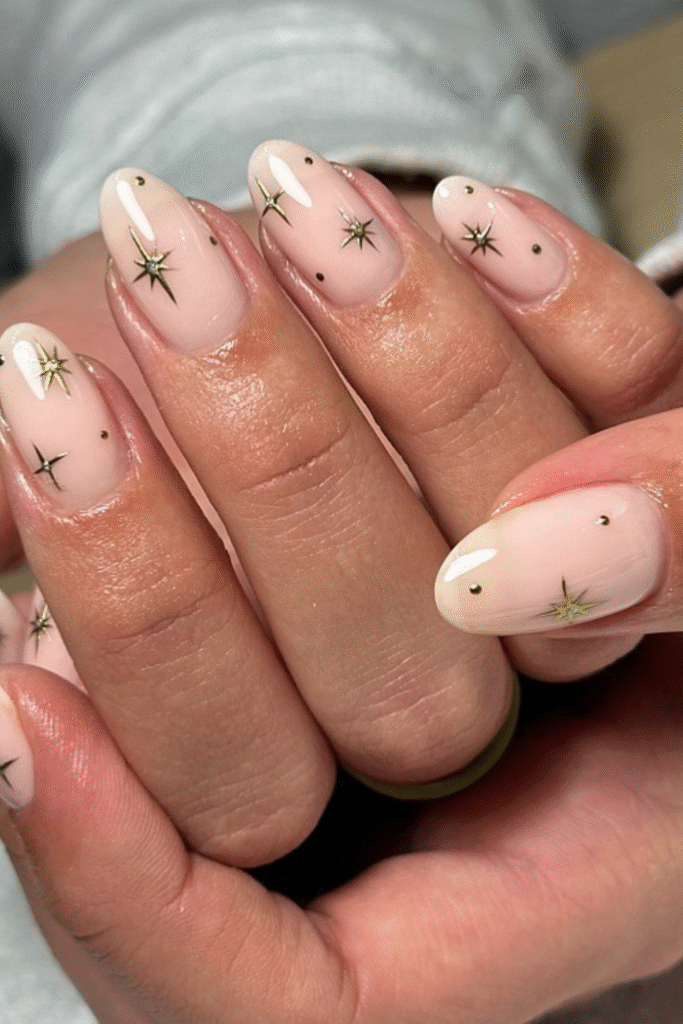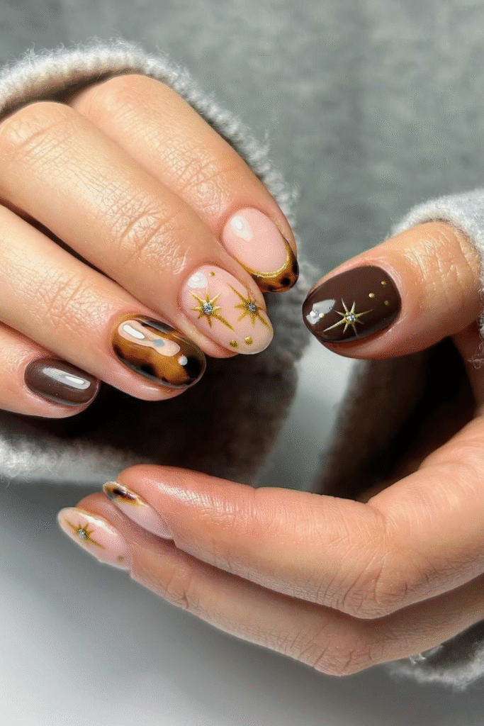 This design blends earthy tortoiseshell with soft nude and golden stars for a look that feels warm and luxe at the same time.