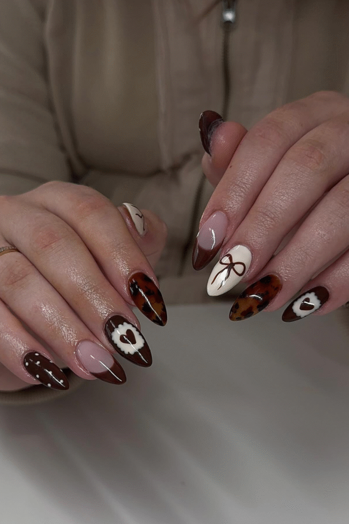 The deep chocolate tones mixed with tortoiseshell tips and delicate bow art give you that soft but rich fall vibe.