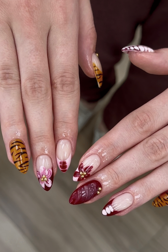 The plum base mixed with tortoiseshell tips gives a polished, moody vibe perfect for date nights or evening parties.
