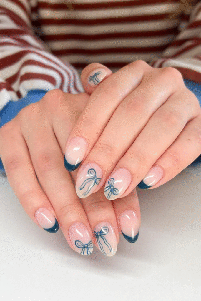 The clean nude base with navy French tips and delicate bow drawings gives your nails a fresh, elegant finish.