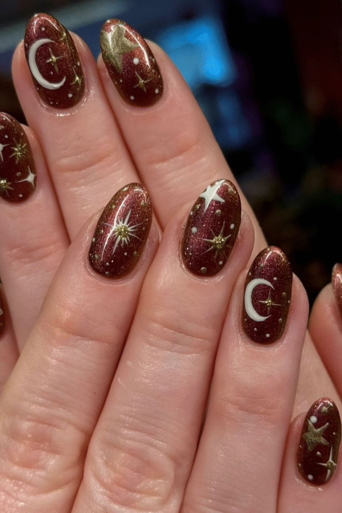 When you pair a glittery burgundy base with gold stars, it looks like you’re wearing the night sky.