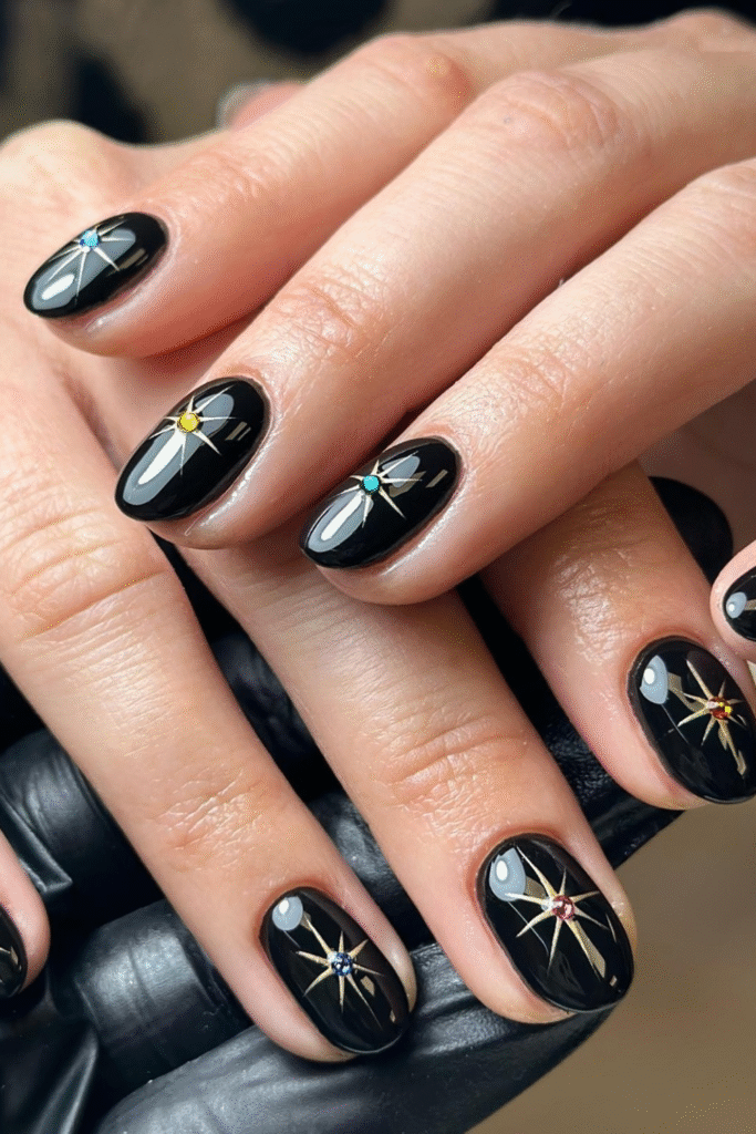 Black nails always make a statement, but adding tiny gold stars and gems takes it to another level.