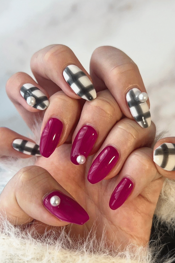 The bright magenta nails give energy, while the grey plaid with pearls adds that little “I planned this” touch.