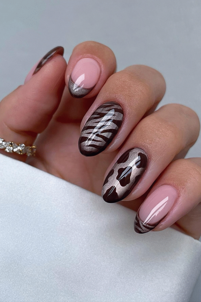 The metallic brown base with zebra and tortoiseshell detailing gives your nails that fall into winter richness.