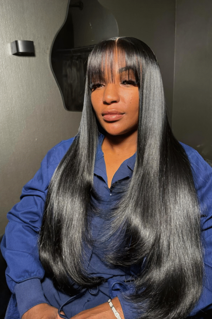 You change your entire vibe with a straight sleek weave paired with full bangs.