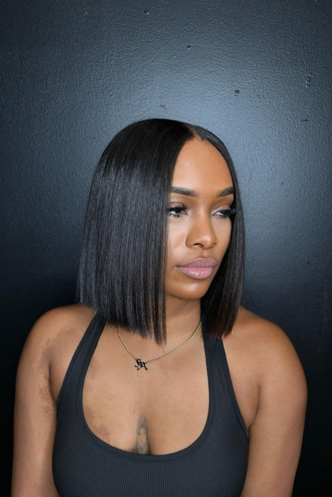 You get clean precision through this sharp blunt bob that frames the jawline sharply.